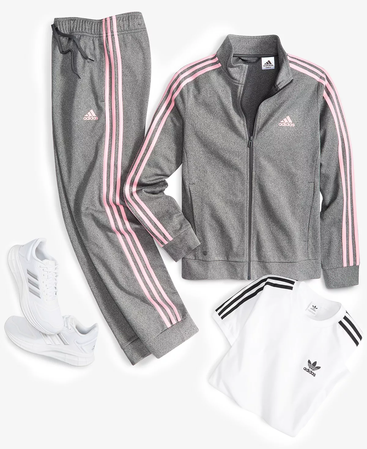 Hit up the gym or the grocery store in classic adidas style with these 3-Stripe essentials. The zip-up jacket and pants are perfect for warm ups, cool downs or just lounging around the house.