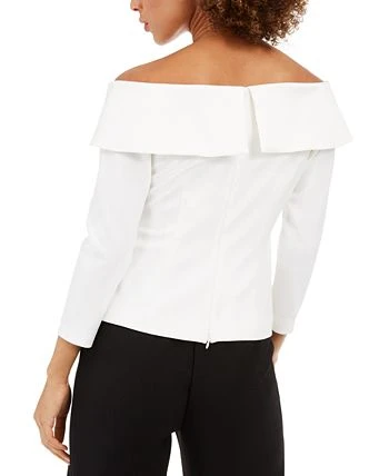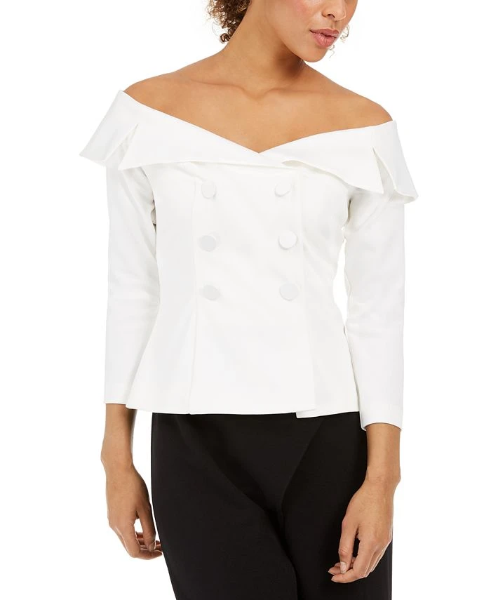 Adrianna Papell’s tuxedo-inspired top features a shoulder-baring neckline and double-breasted buttons at the front.