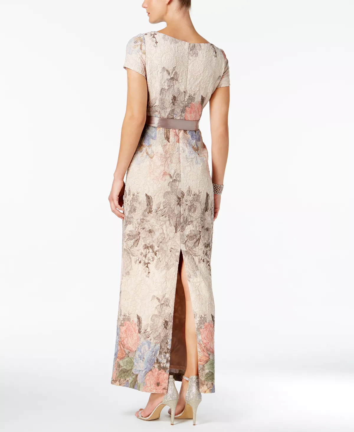 A textured finish and pastel florals add glamour to Adrianna Papell’s elegant column gown. A satin ribbon belt ties the look together.