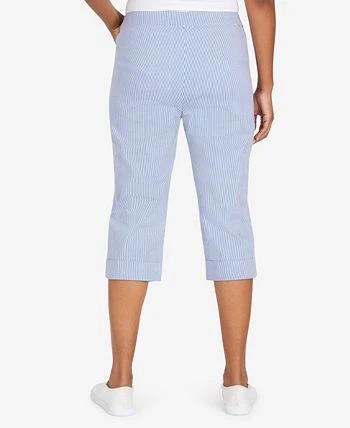 Add some variety to your bottoms collection with our stripe allure clamdigger featuring a flat-front waistband, elastic back, and side seam pockets.