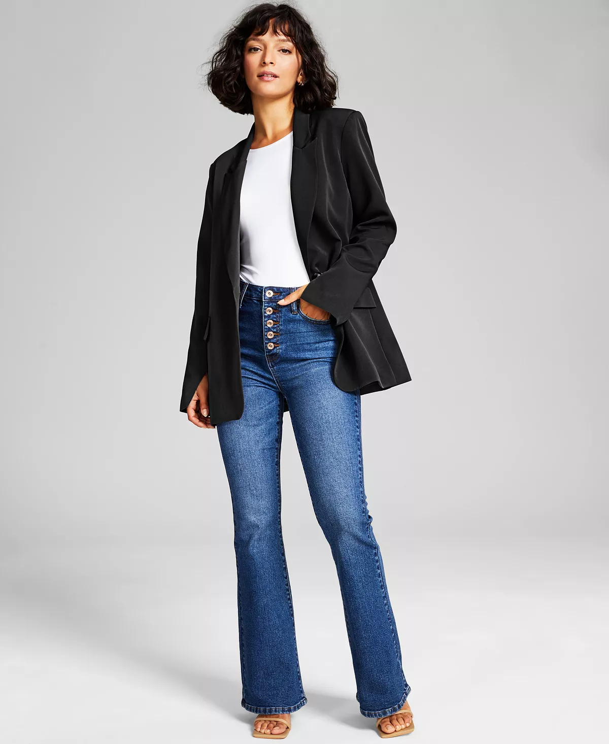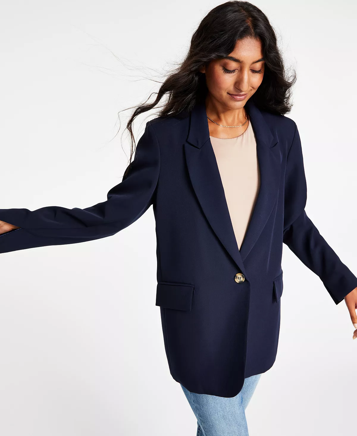 Add a professional polish to any outfit with this versatile And Now This’ sophisticated oversized blazer, a flattering one-button design finished with modern split cuffs. This Blazer has a deep v neckline and is fully lined.