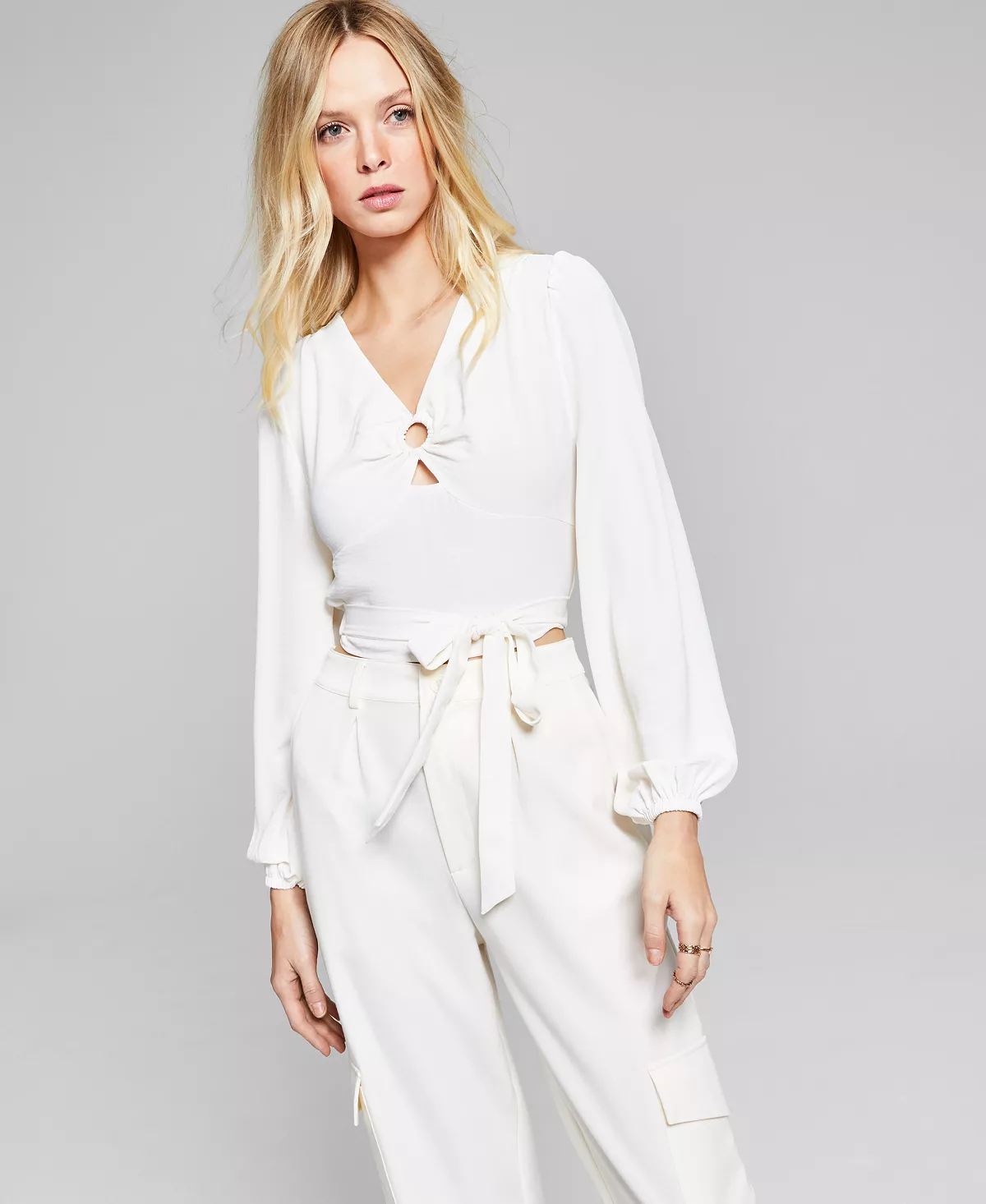 Peekaboo details and big sweeping sleeves balance the sleek cropped fit of this blouse from And Now This.