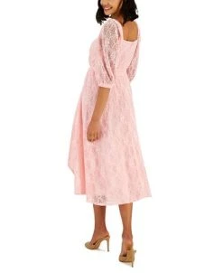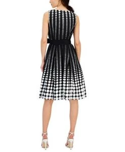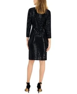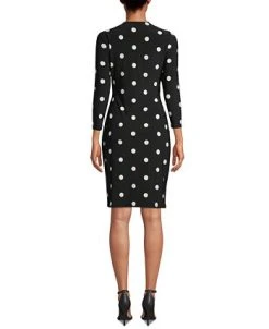 - Dress: back zipper with hook-and-eye closure, sheath silhouette, slit at back hem