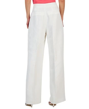 An asymmetrical close and chic wide-leg silhouette lend a sophisticated flair to these high rise pants from Anne Klein.