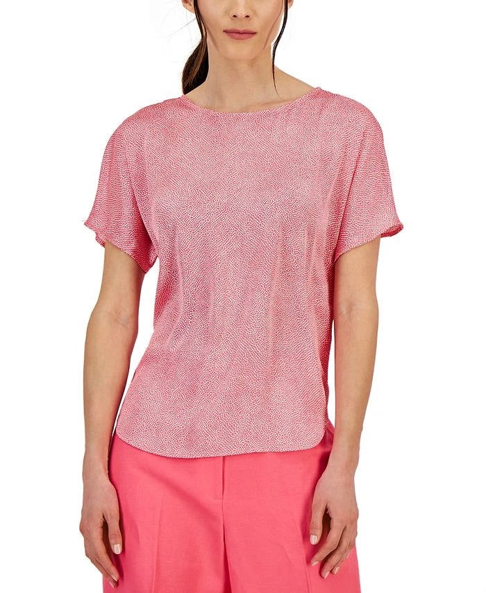 An allover tiny dot print draws the eye in this flowing bateau-neck top from Anne Klein.