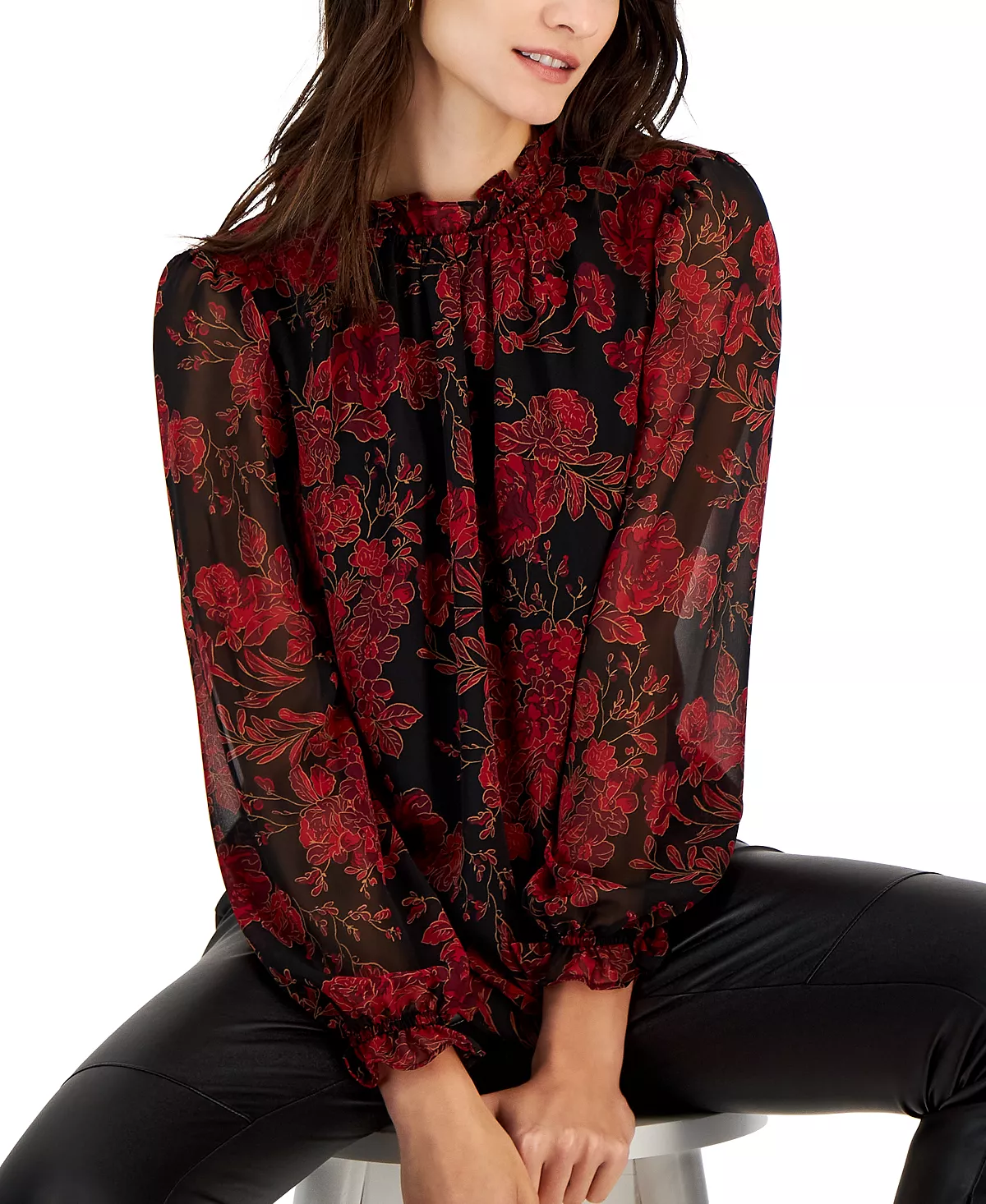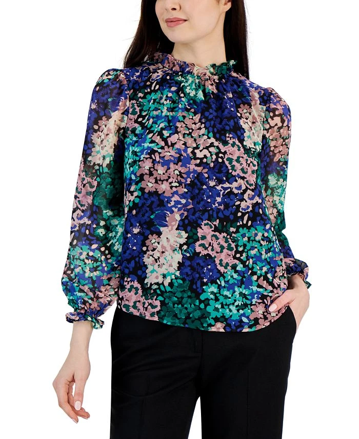 Anne Klein adds sophisticated style to your wardrobe with floral-print blouse, featuring a ruffled neckline for added elegance.