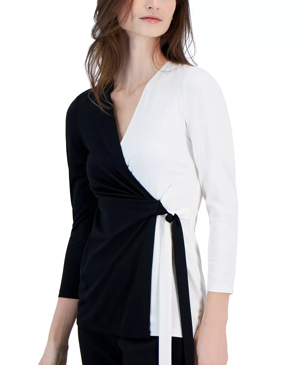 Tackle your busy day with elegance in this women’s faux-wrap top from Anne Klein.
