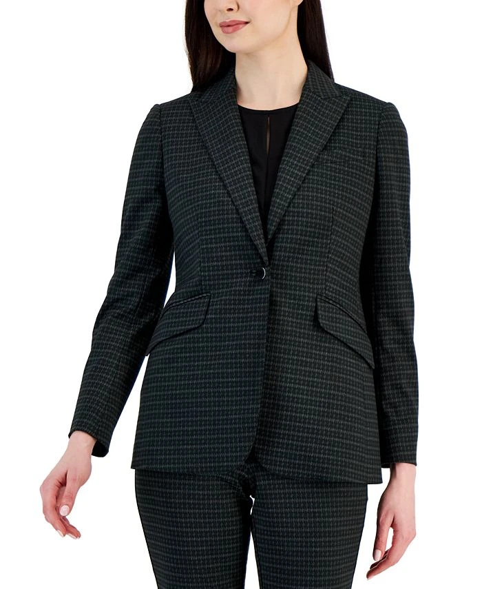 A classic houndstooth print covers every inch of this compression blazer from Anne Klein, designed with a single button to cinch the waistline.