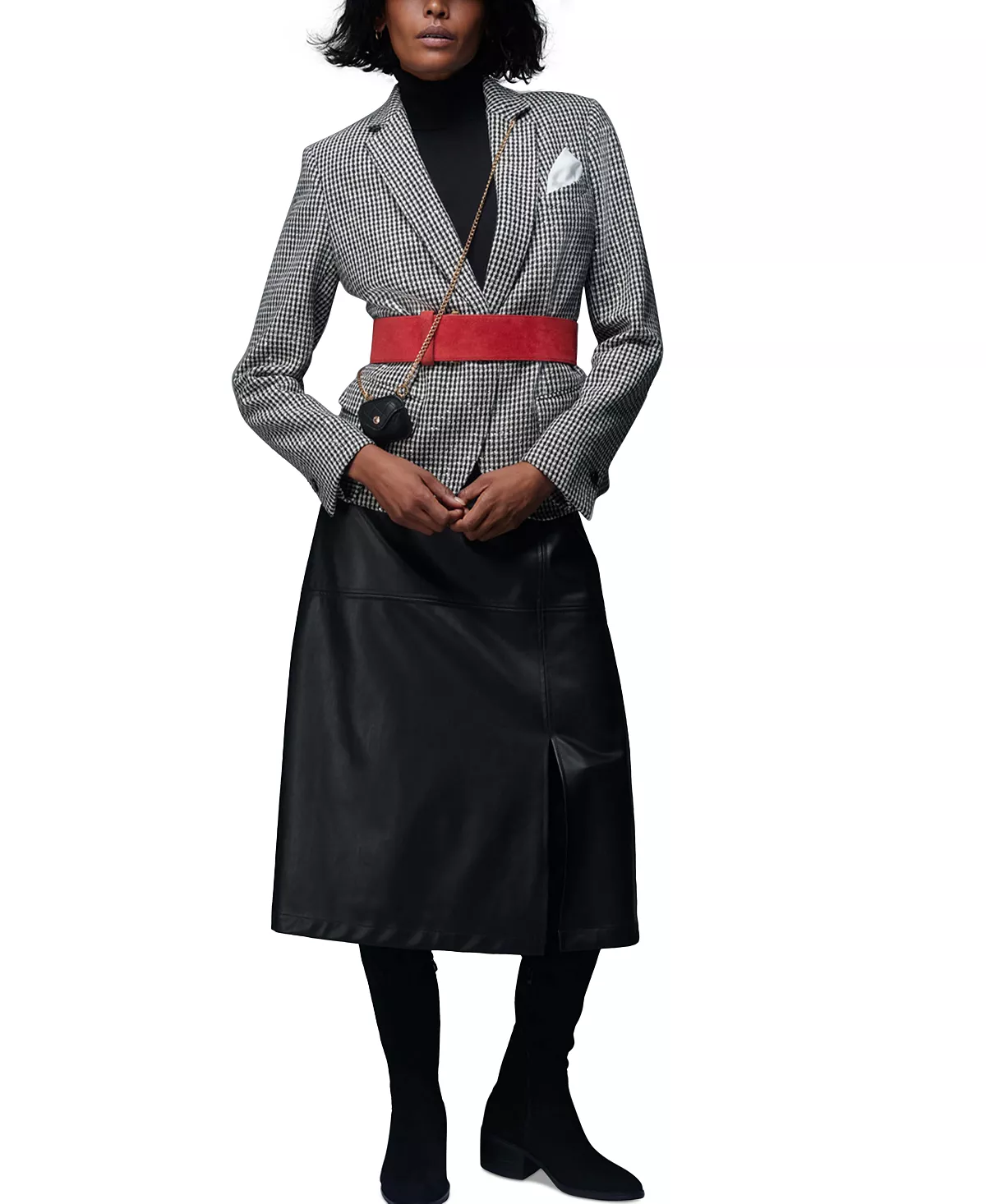 A metallic finish lends an elevated feel to Anne Klein’s tweed jacket.