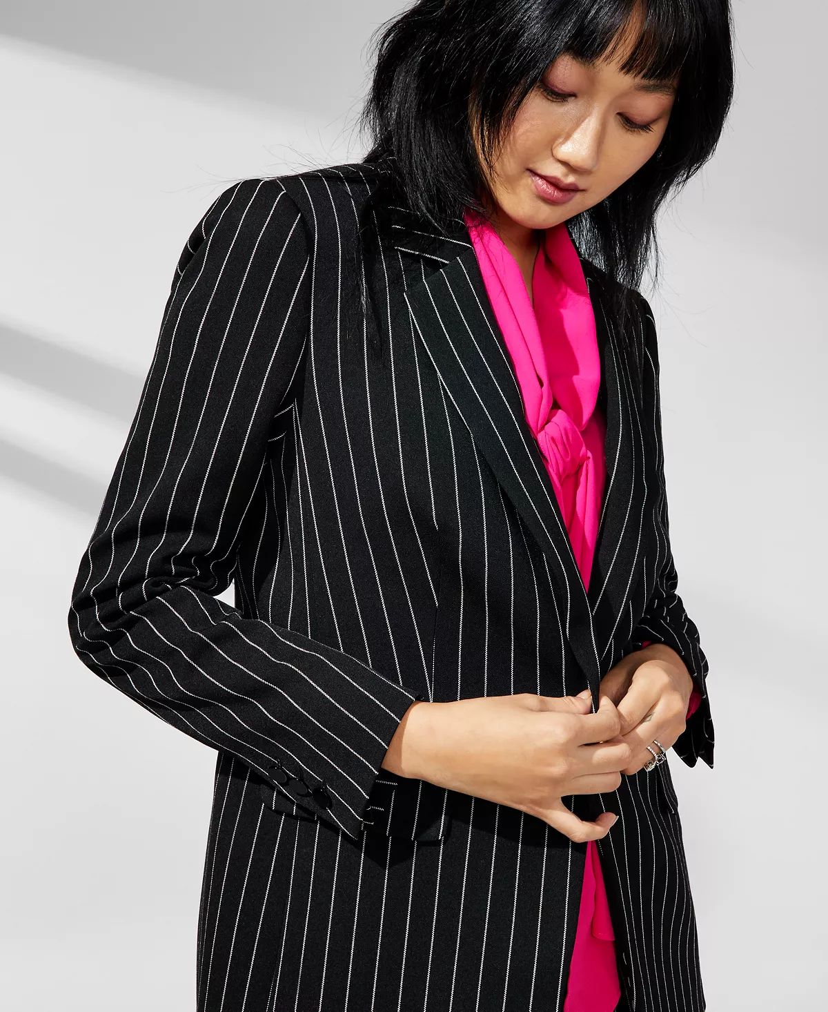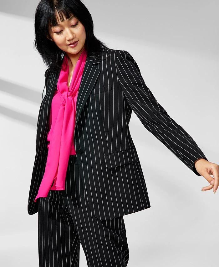 A classically sleek one-button jacket by Anne Klein is effortlessly elevated with a timeless pinstripe, the perfect way to add professional polish to your workweek look.