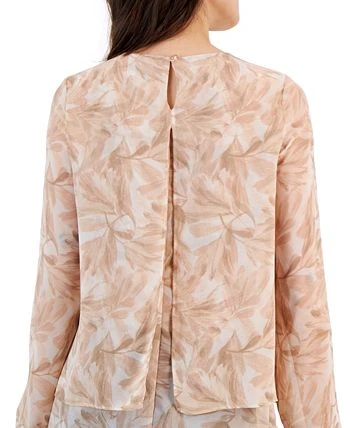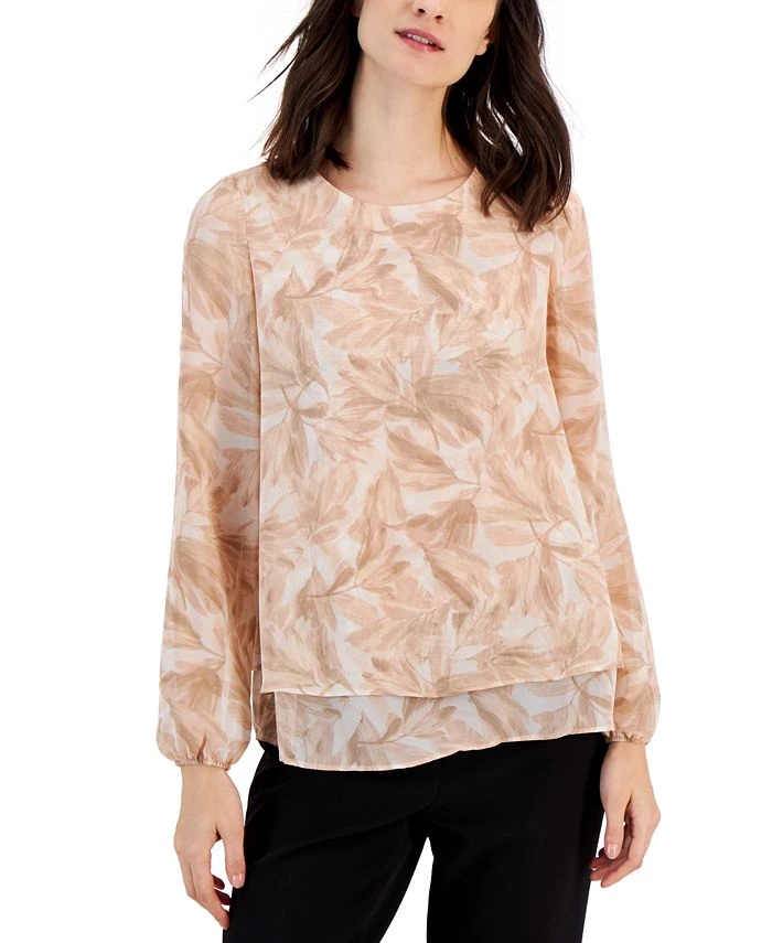 Anne Klein adds an elegant touch to a long-sleeve blouse, styling it with a split back and a layered hem.