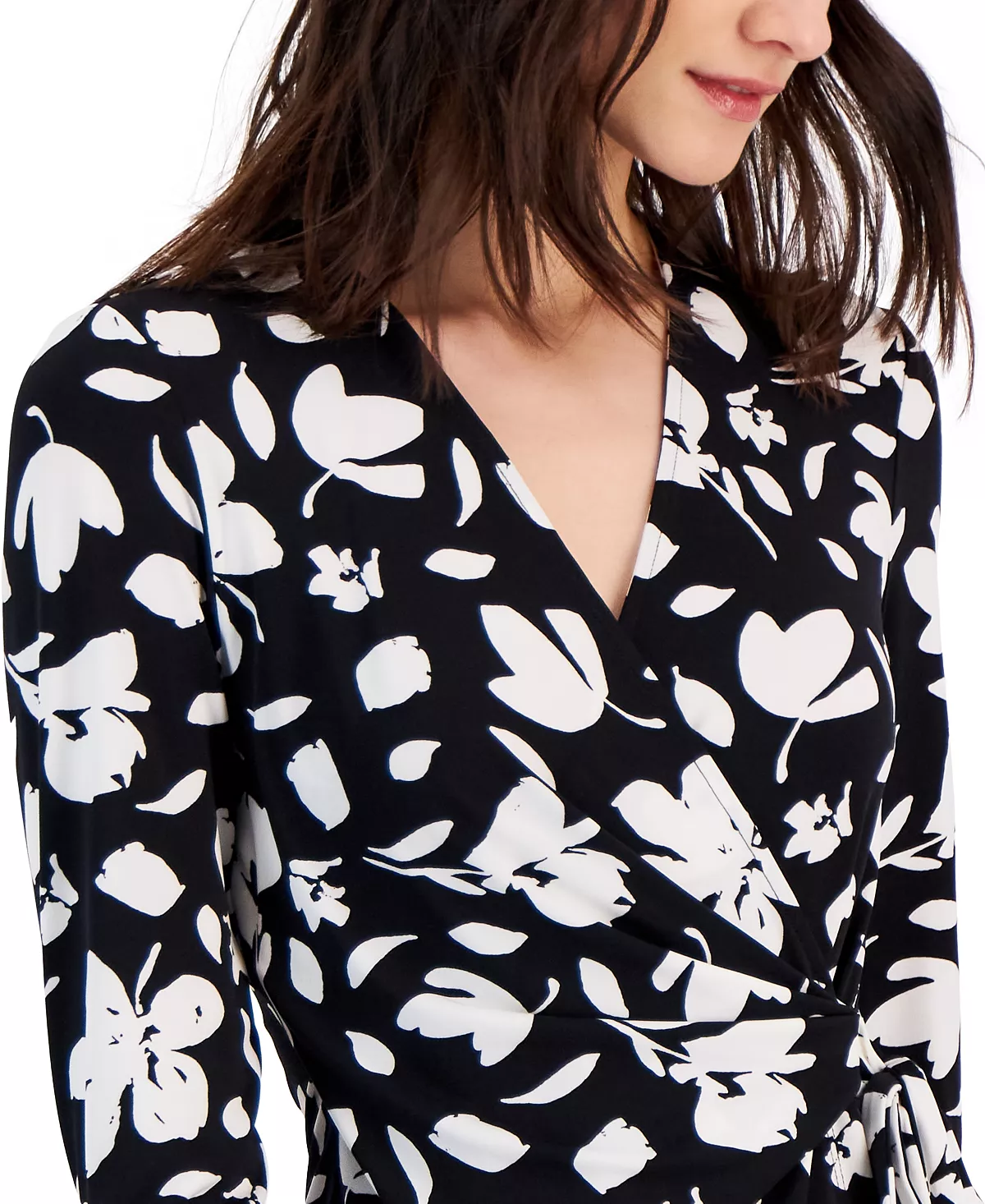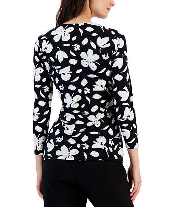 Chic in a bold and sophisticated print, this Anne Klein top features a flattering faux-wrap design.