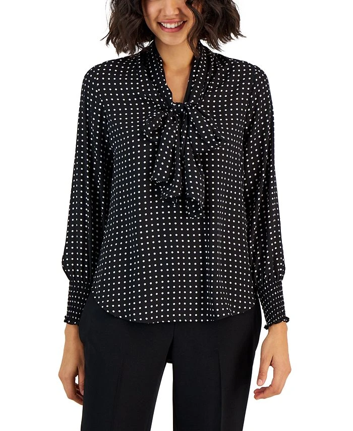 Lend a little whimsy to your career collection with this beautifully printed top from Anne Klein designed with a tie at the neckline.