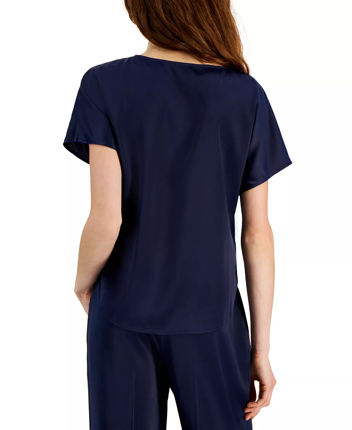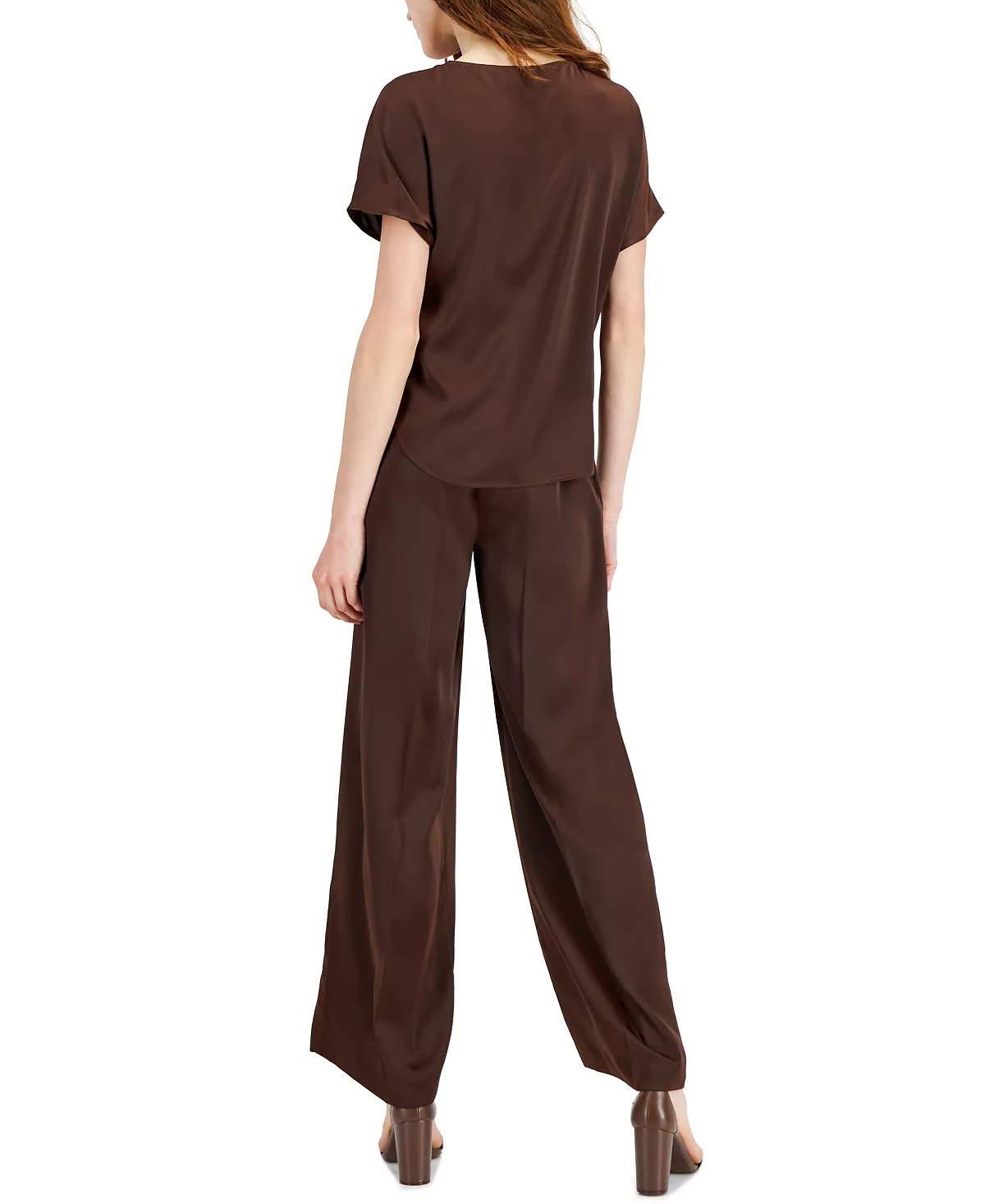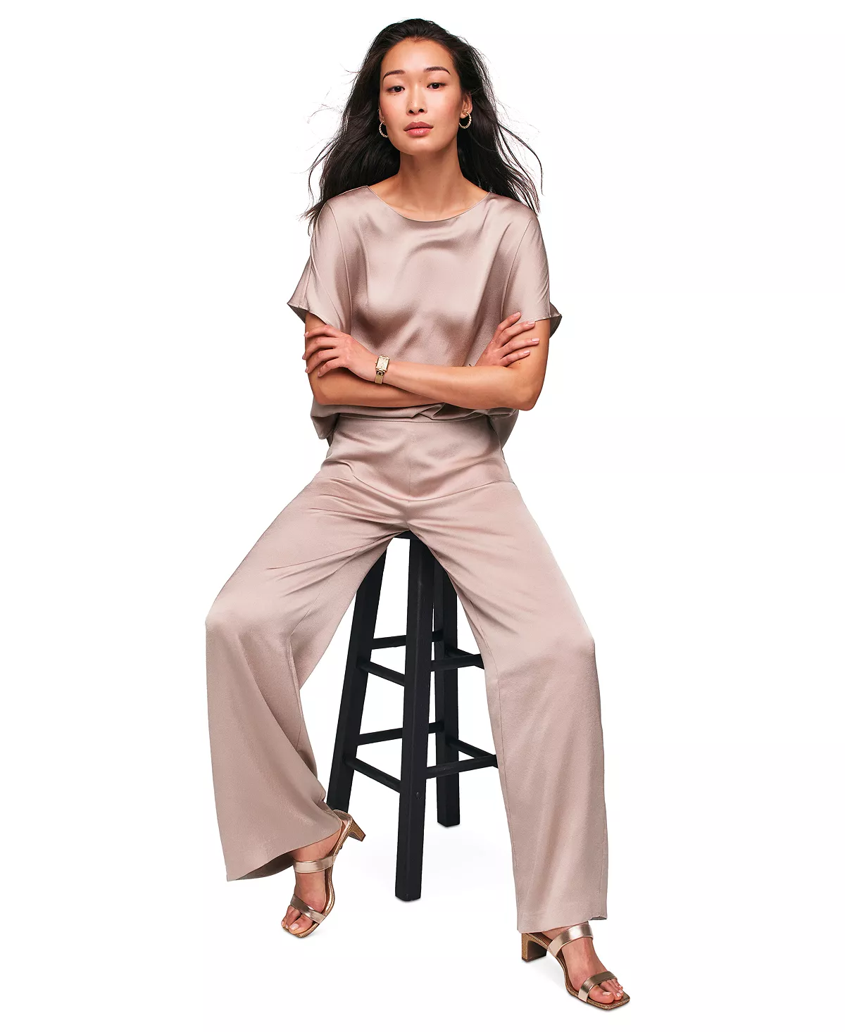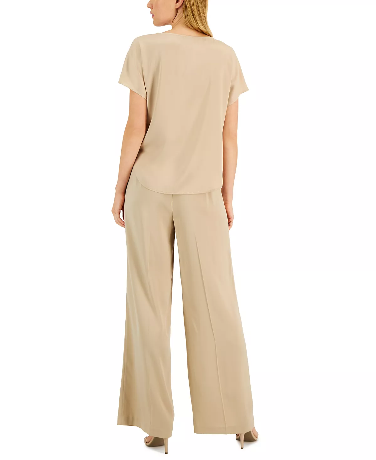 Be stunning in satin with this ultra-chic look from Anne Klein, featuring a boat neck top and flattering wide-leg pants.