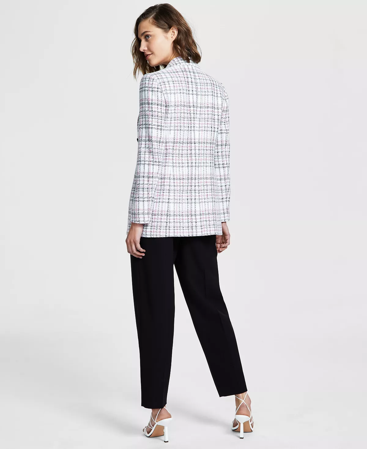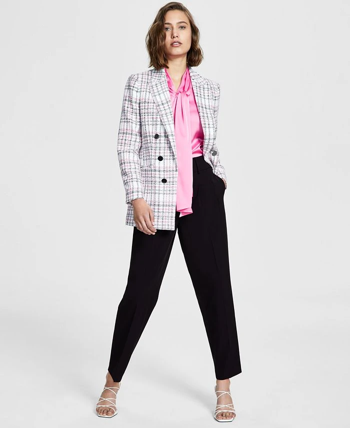 Breathe some fresh air into your work look in this Bar III ensemble, combining a plaid boyfriend-cut blazer with a long-sleeve tie-neck blouse and easy-to-wear pull-on pants.