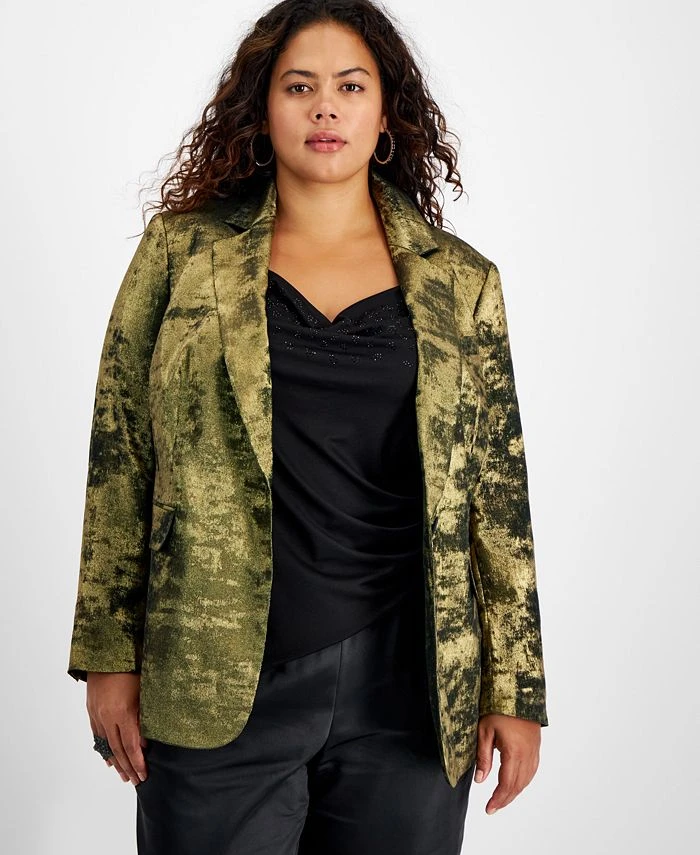 Rich shades of shimmer dramatically dress up the classic notched collar one-button shape of this plus size metallic jacket from Bar III.
