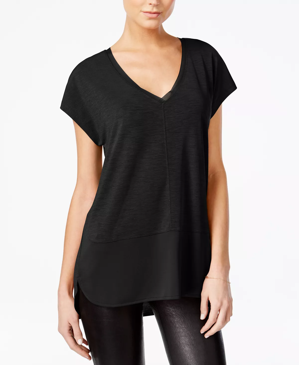 A smooth contrast hem lends airy style to this chic, lightweight top from Bar III.