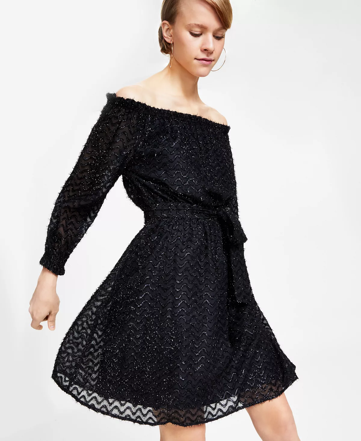 Swirls of sparkly eyelash detail lend endless drama and depth to this chic off-the-shoulder dress from Bar III. A smocked waistline completes the look.