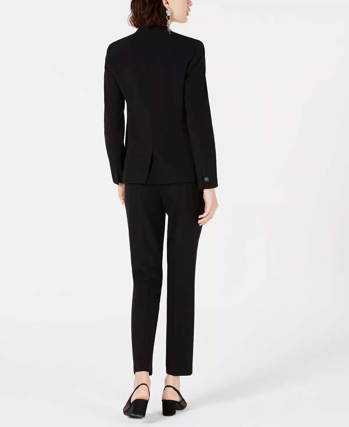 Bar III’s open front jacket and slim pants offer a contemporary career look, with a printed blouse for a touch of personality.