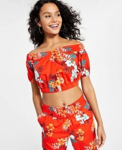 Bar III delivers a new wardrobe favorite with this women’s off-the-shoulder top featured in a dynamic print.