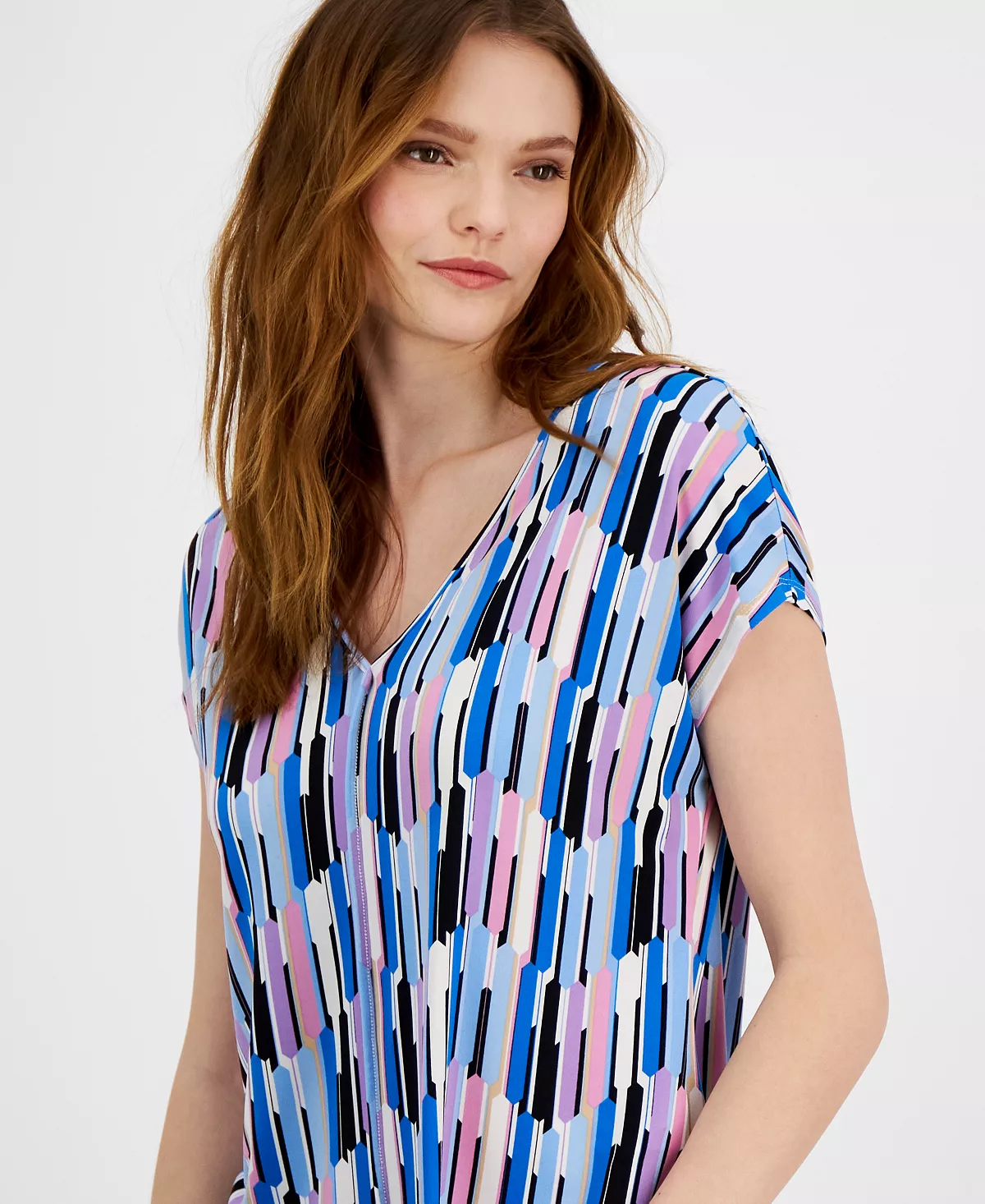 A fashion-forward twist on the beloved T-shirt, this vibrant V-neck top from Bar III takes center stage with a seamed front.