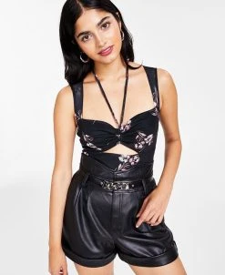 Bar III keeps your top tucked in all night with this beautiful floral-print bodysuit, a chic sweetheart-neck design finished with an edgy front cutout.