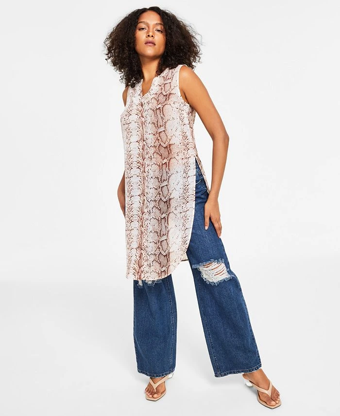 Add some wild to your style with Bar III’s snakeskin print top, a breezy sleeveless top in a longer length that’s ideal for layering over skinny jeans and leggings.
