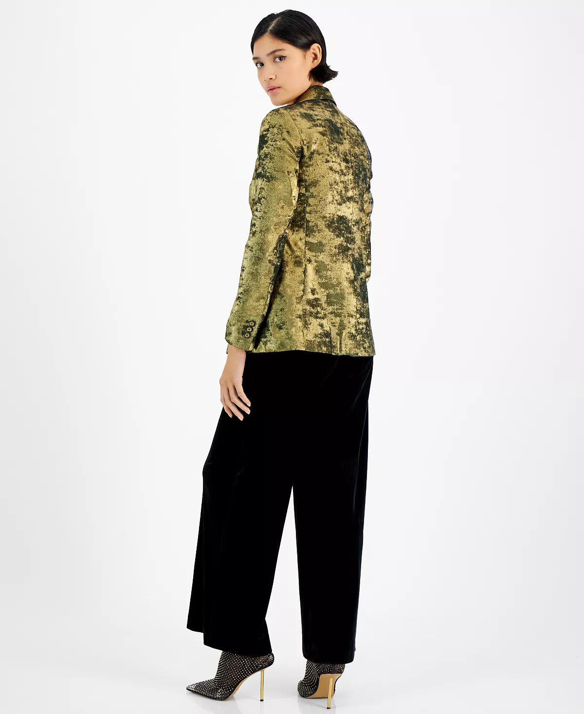 Texture and tones take center stage as Bar III’s plush velvet jumpsuit and lustrous metallic jacket make a show-stopping ensemble.