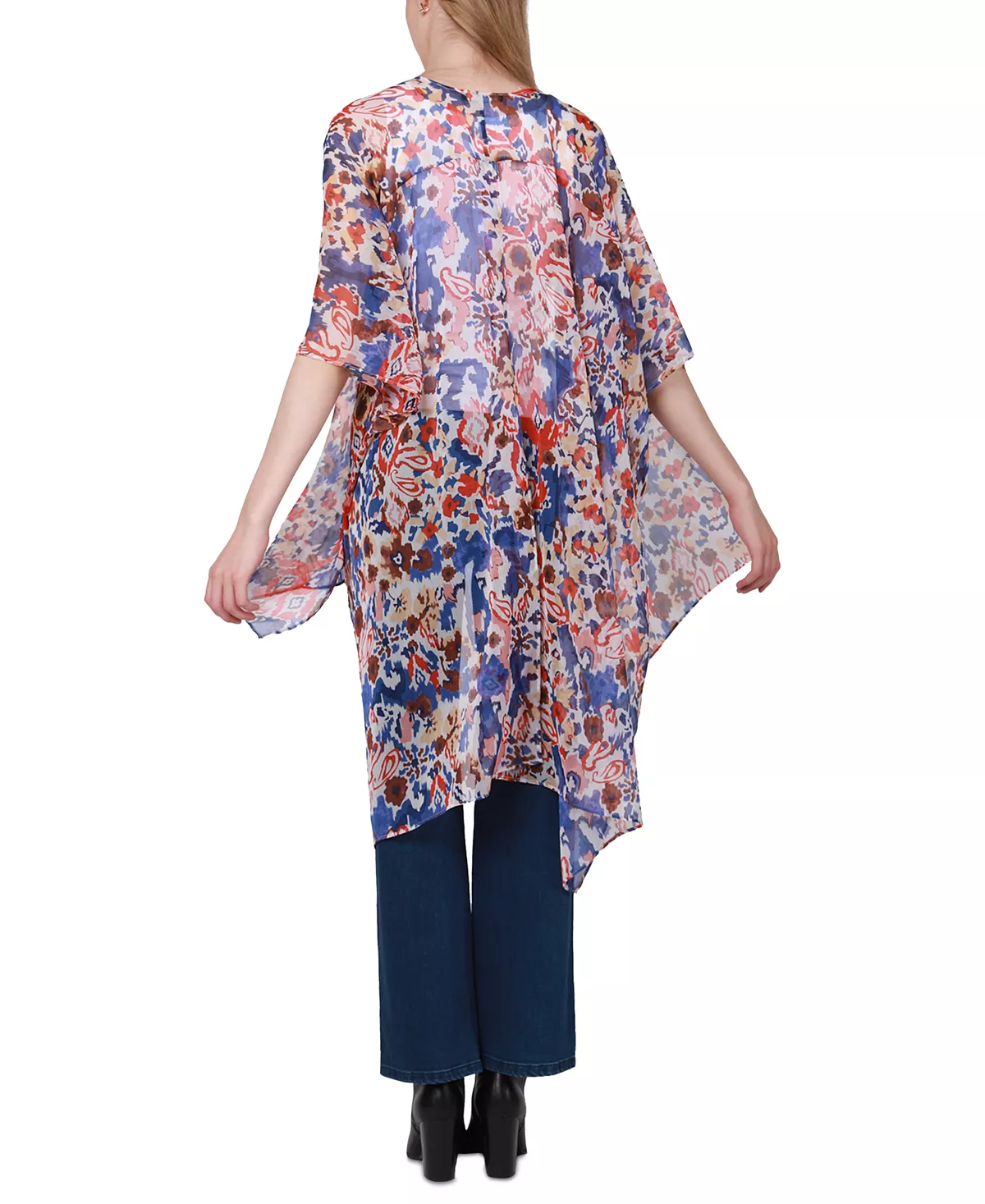 Add a bright top layer to any look in this fun floral-print kimono from Black Tape.