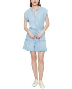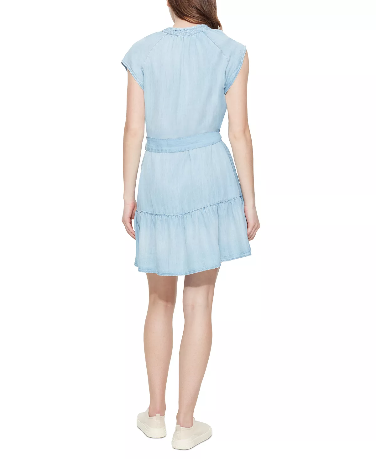 - Round notch neckline with tie; Mini silhouette