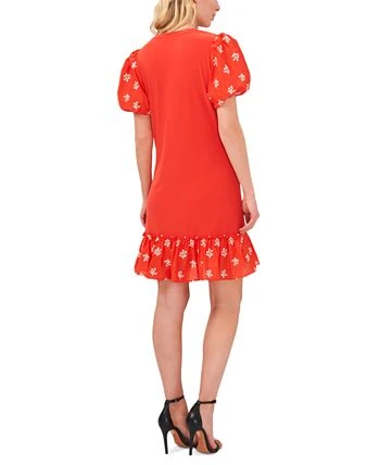 CeCe brings us a timeless essential, a little black dress featuring contrasting sleeves and hemline for an ultra-chic finish. The puff sleeves and ruffled hem are adorned with charming embroidered florals, for an added burst of style.