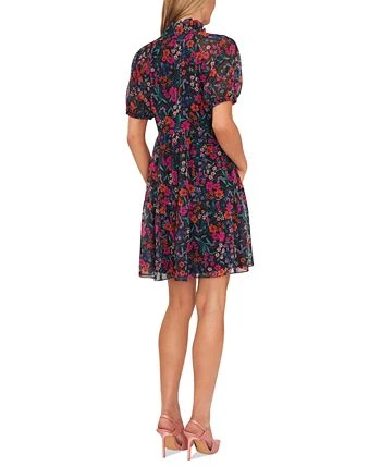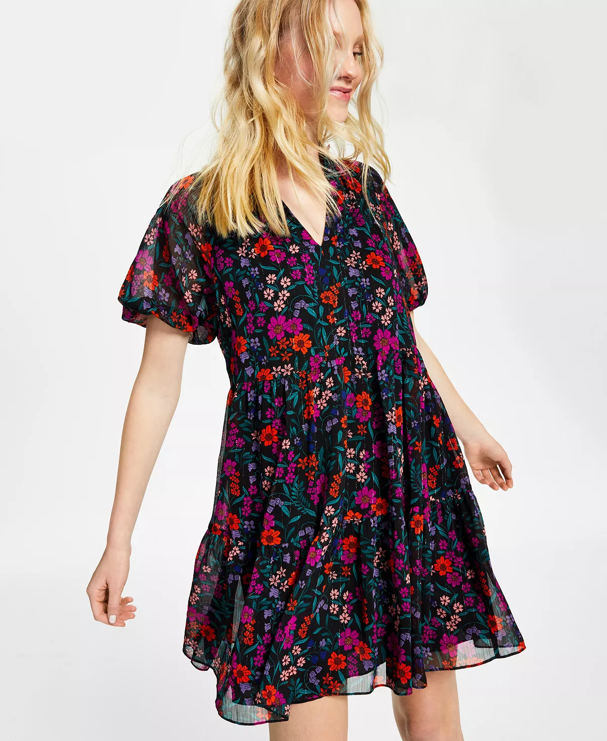 Playful puff sleeves frame the sides of CeCe’s adorable babydoll dress, a charming floral-print piece accented with a tiered pleated skirt.