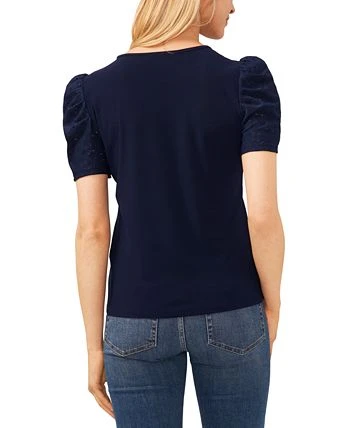 Reinvent your casual style with this mixed-media top from CeCe designed with puff sleeves and a classic neckline.