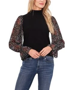 A beautiful floral-print sleeves with a clip dot texture bring an extra dose of sweetness to this knit top from CeCe.