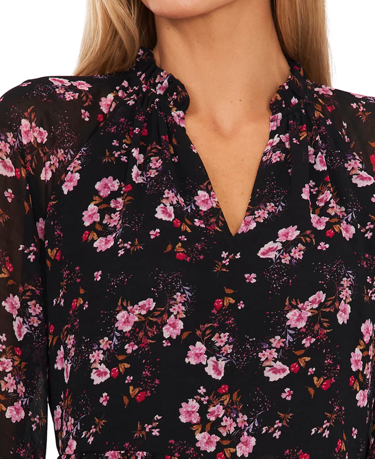 Charming ruffles adorn this floral print dress from CeCe, keep it causal with flats or pair with heels for a dressy finish.