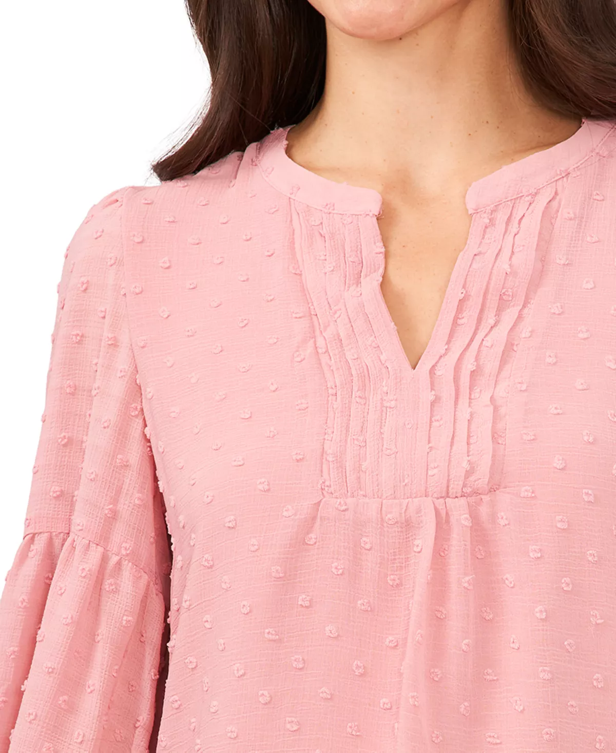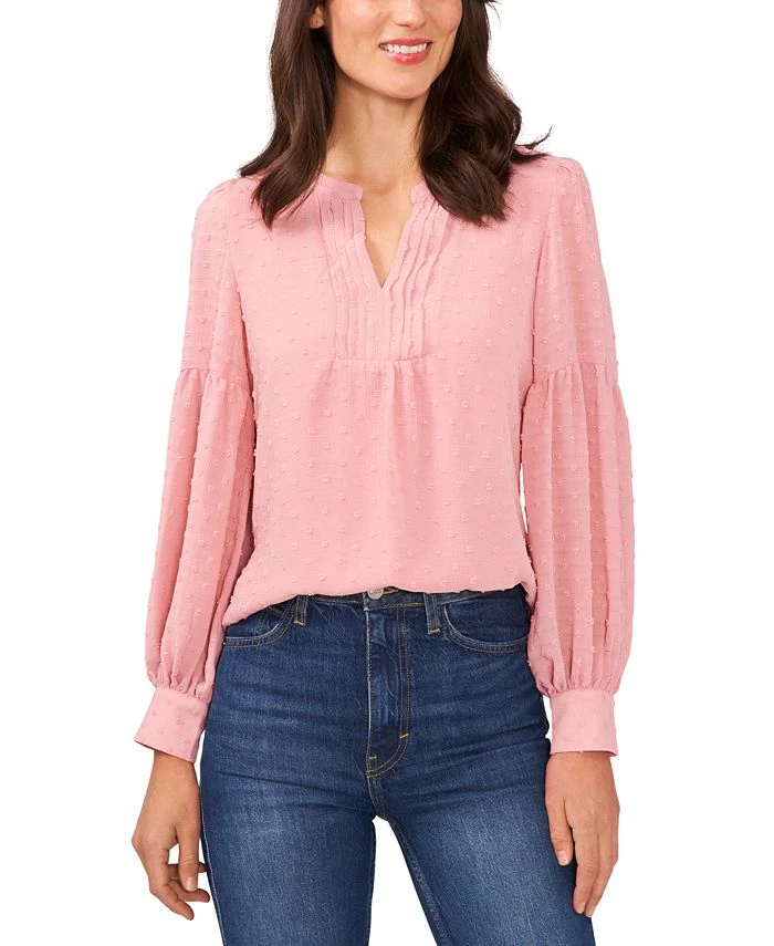 A unique Swiss dot texture defines CeCe’s lovely top, a soft pintuck-trim design framed by long blouson sleeves for added grace.