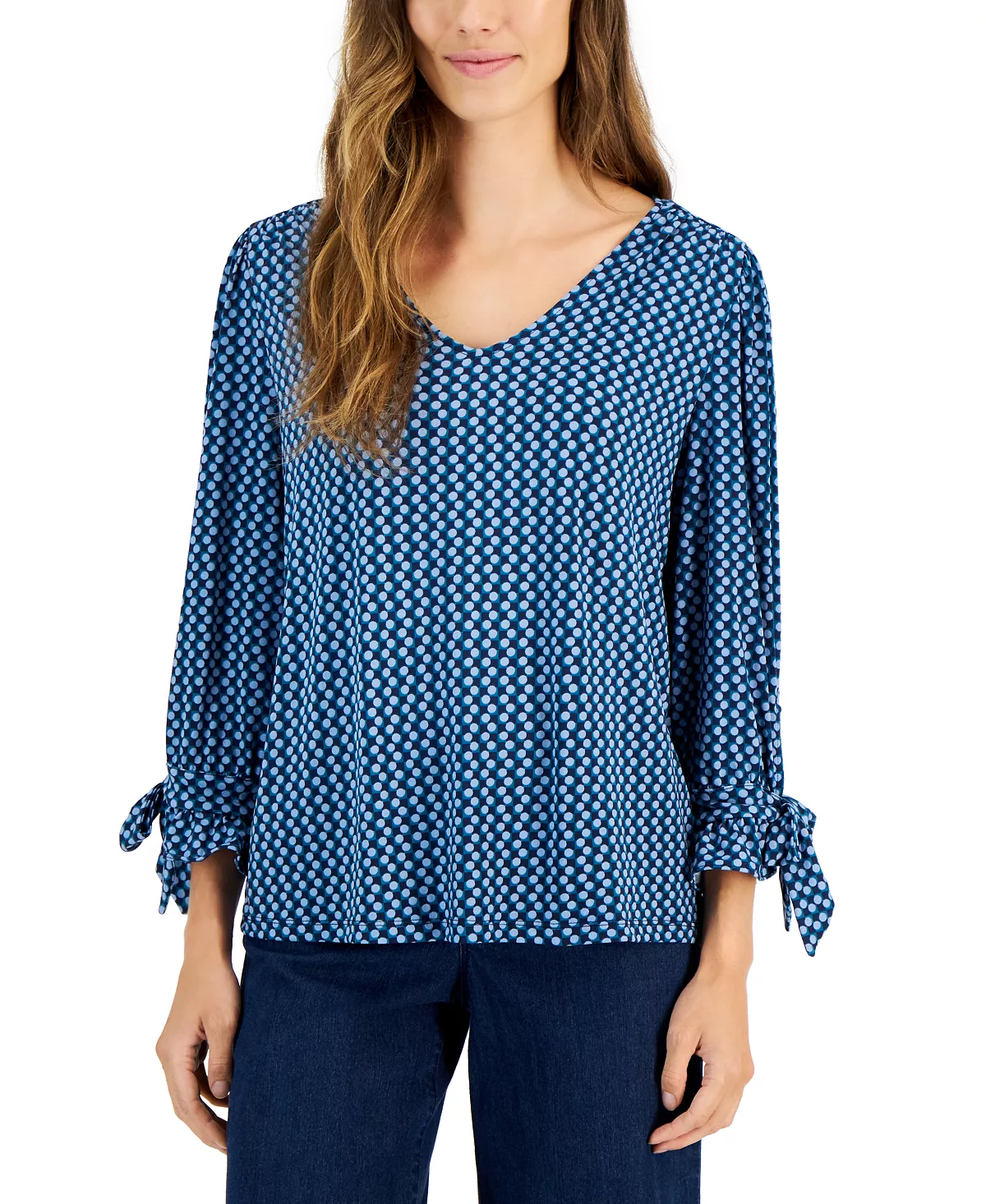 Charter Club Dresses up this geo-print V-neck design by adding elasticated sleeves with ruffle cuffs and bows.