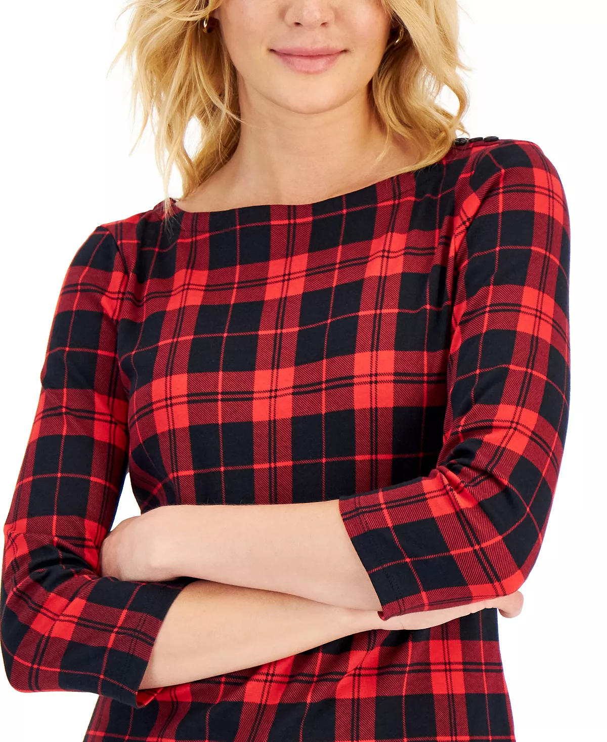 Buttons at the shoulder elevate this easy top from Charter Club, in vibrant plaid and all-cotton knit for a comfy feel.
