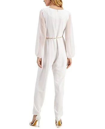 Ornamented with a slender chain belt, this sheer-sleeve jumpsuit is a fashion-forward evening option.