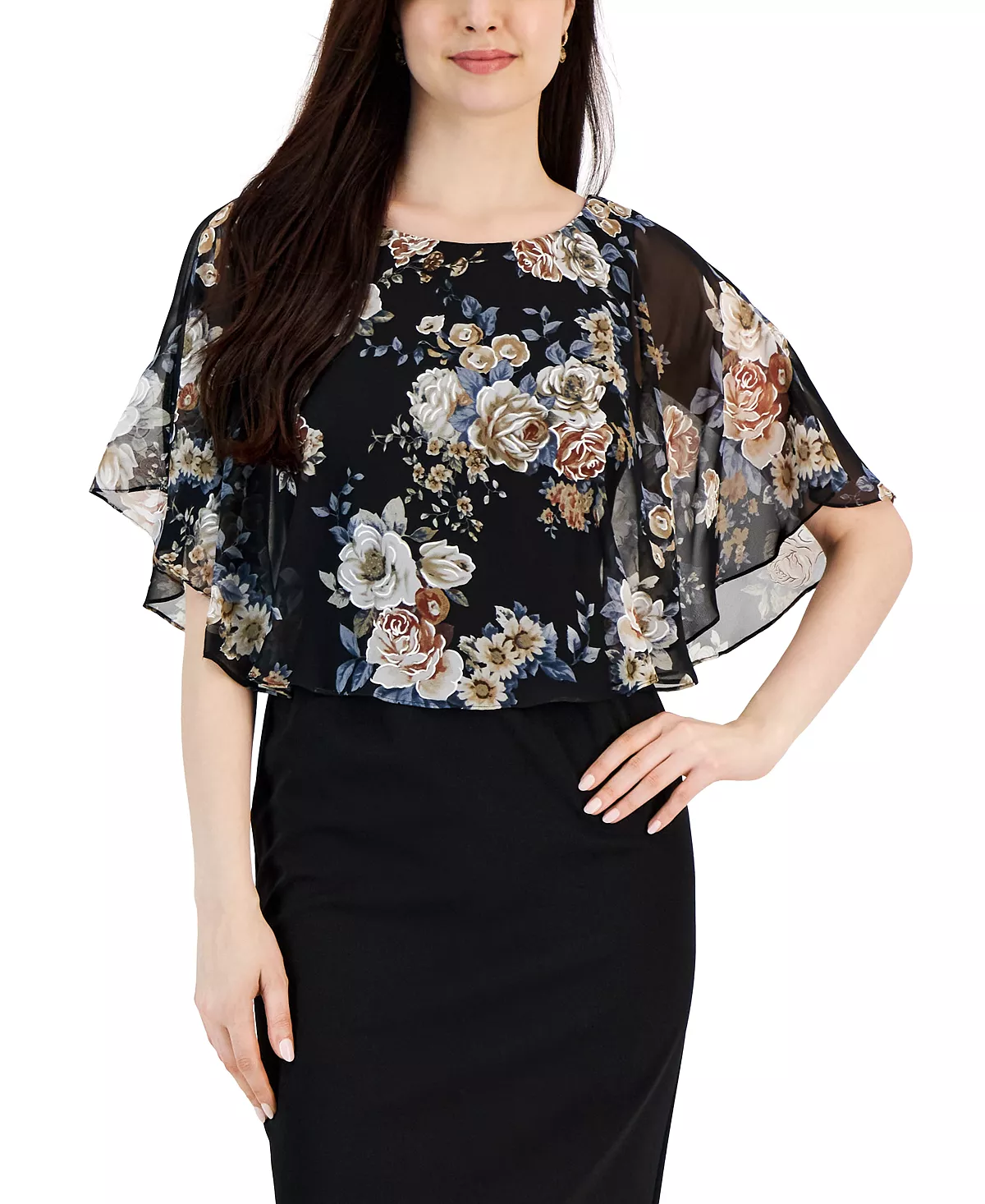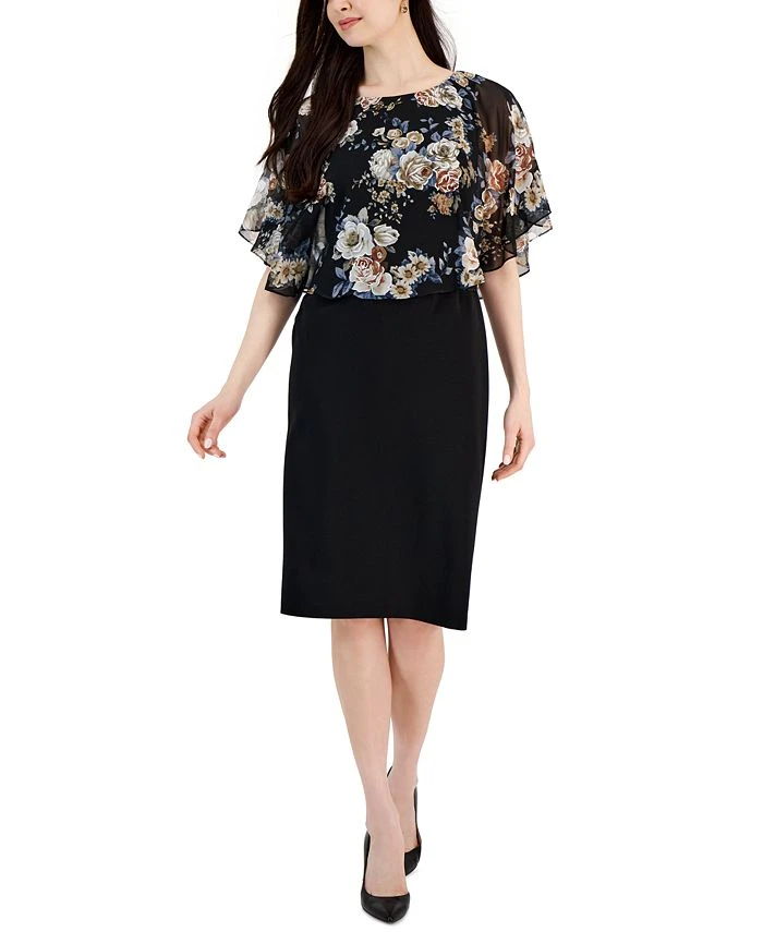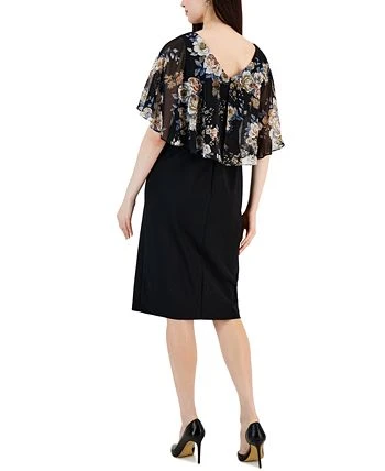 A floral print cape overlay lends feminine flair to this women’s dress from Connected, keep it casual with flats or add heels for a dressy finish.