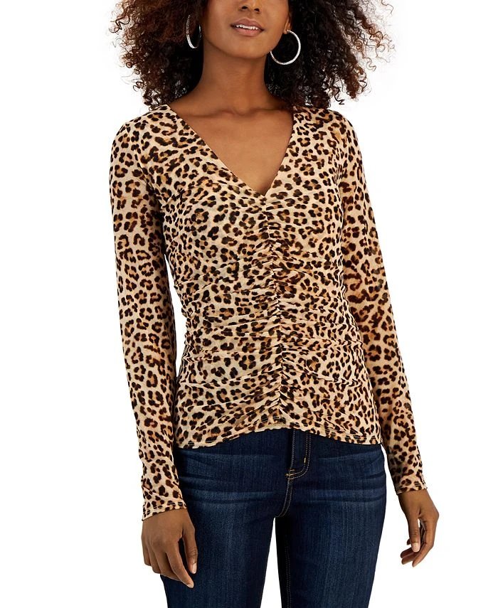 Ruched detailing at front and bold animal prints are the stars of this V-neck top from INC International Concepts.