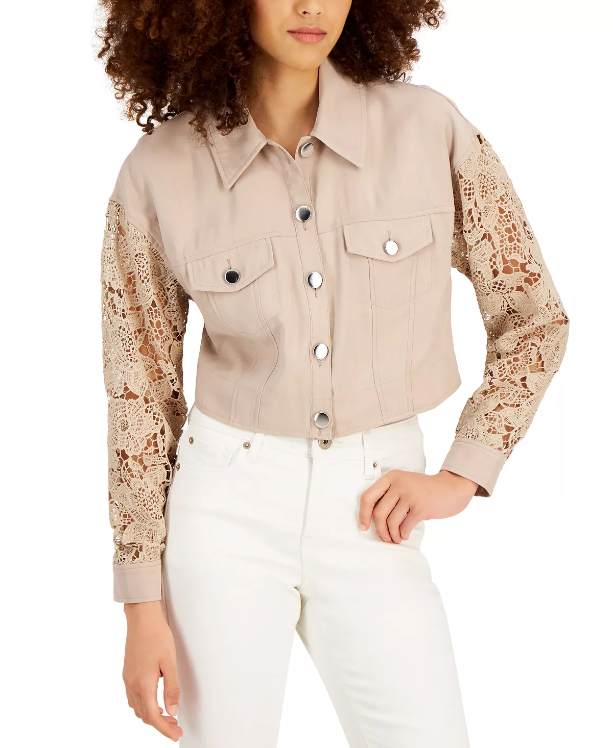 INC International Concepts® updates a classic look in this chic trucker jacket with knock-out lace sleeves.