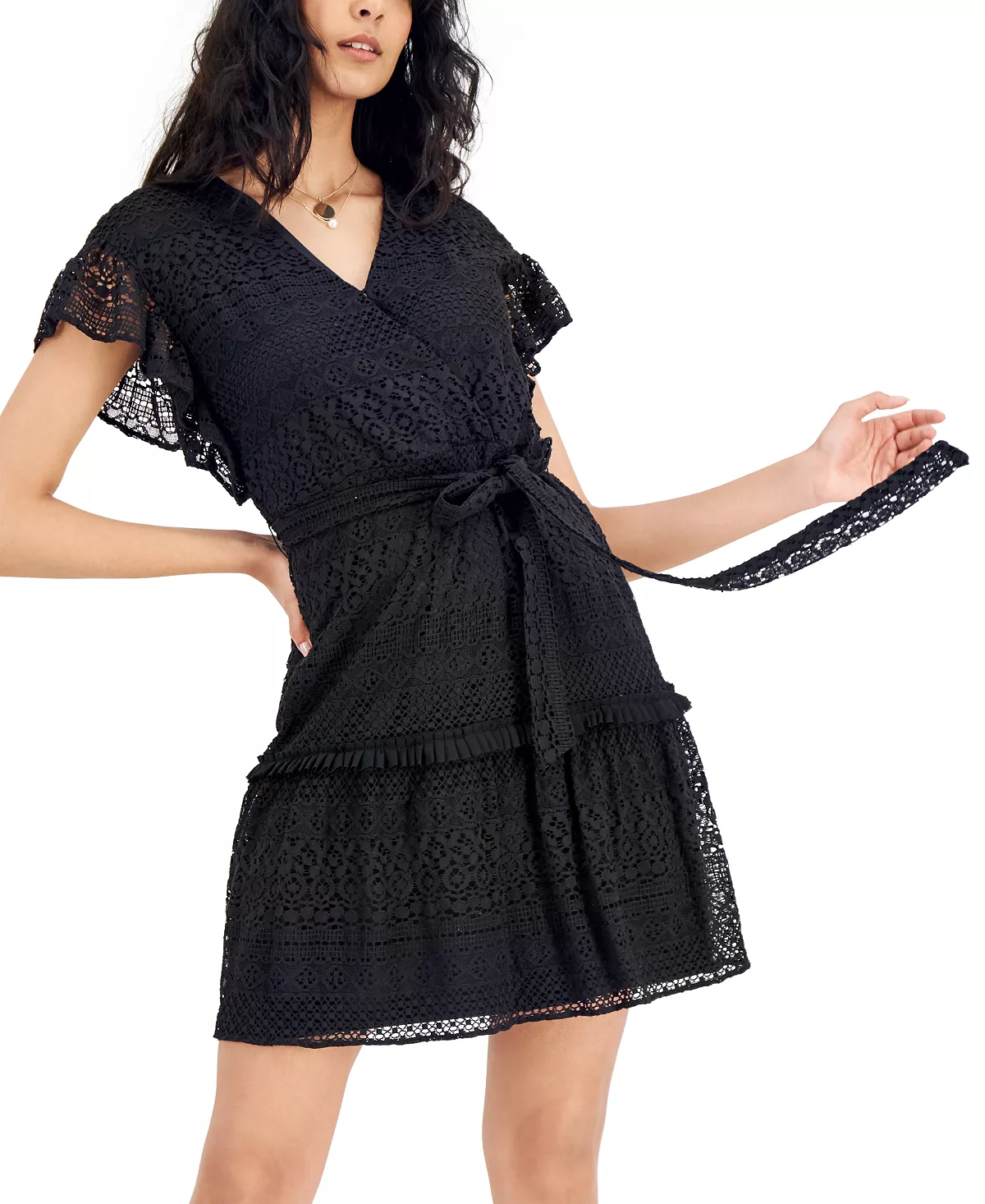 - Lace allover; self-tie belt