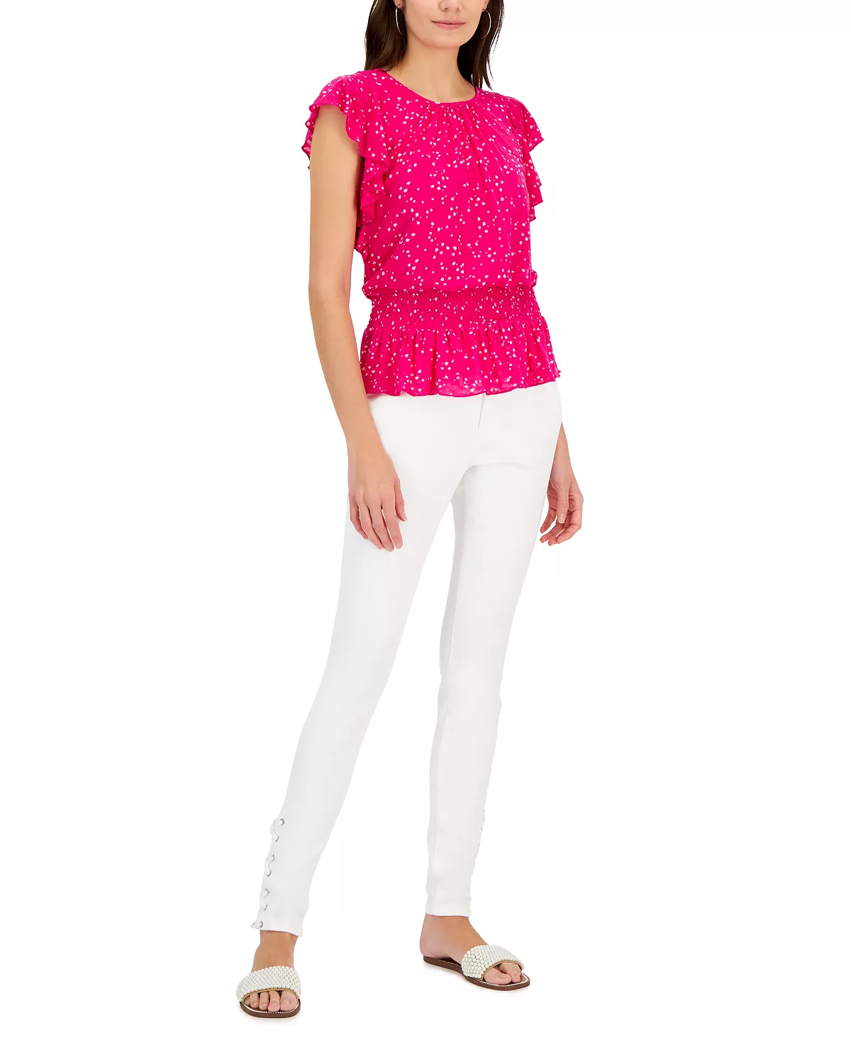 A soft statement in printed ditsy-dot knit, this INC International Concepts top combines cascading flutter sleeves with a smocked waistline and peplum hem.