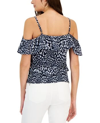 Flowy ruffled V-neck to fitted smocked hemline, soft knit is spotted for smart style in this cold-shoulder top from INC International Concepts.