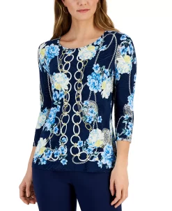 A flowing asymmetrical hem and allover florals come together to make magic in this 3/4-sleeve top from JM Collection.