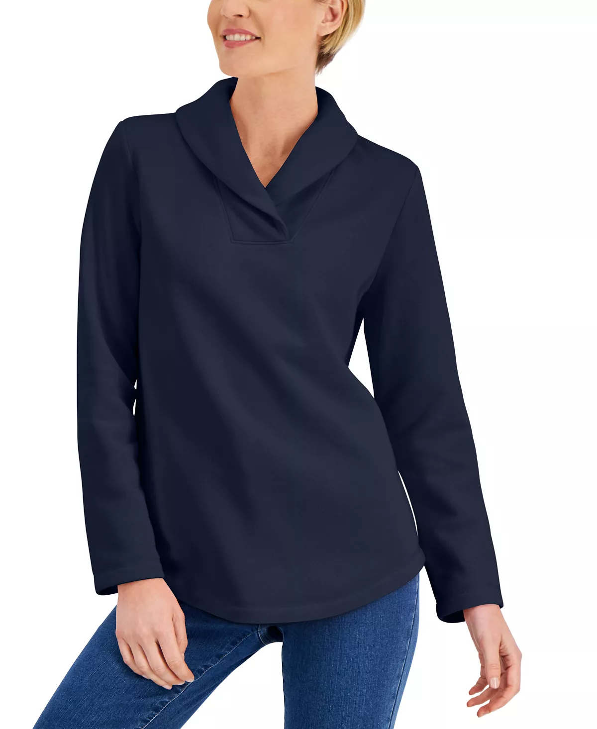 Cozy fleece gets a stylish update from Karen Scott. The relaxed top features a shawl collar for a fresh look.