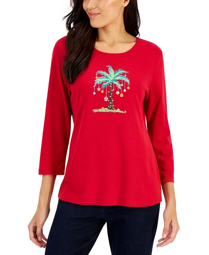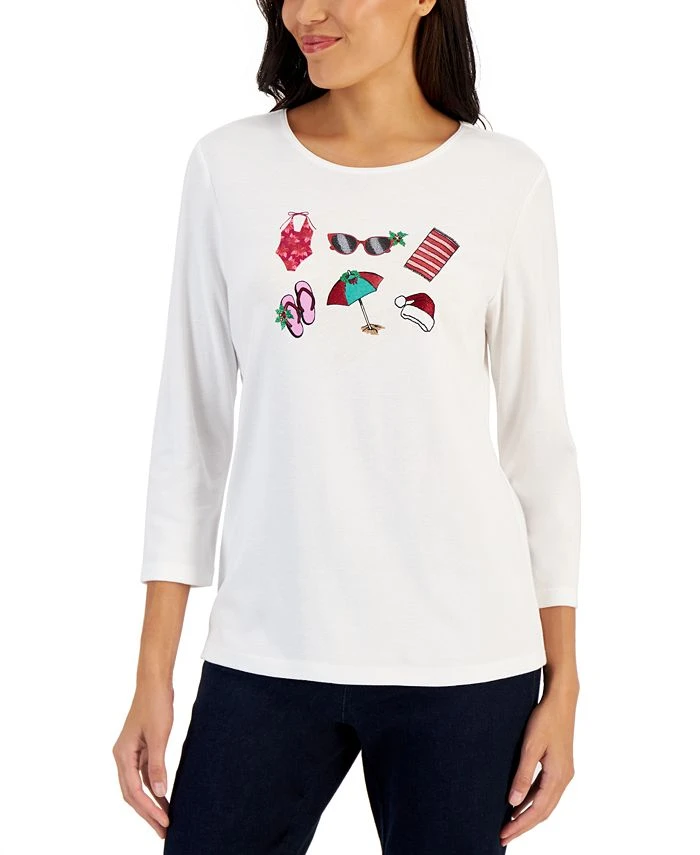 She wears seashells for a fun, festive look. This relaxed knit top from Karen Scott features glittery details and an ocean-fresh vibe.