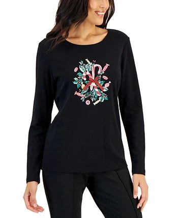 The perfect top to dress up or down, this Karen Scott design combines comfort and an embellished holiday print.
