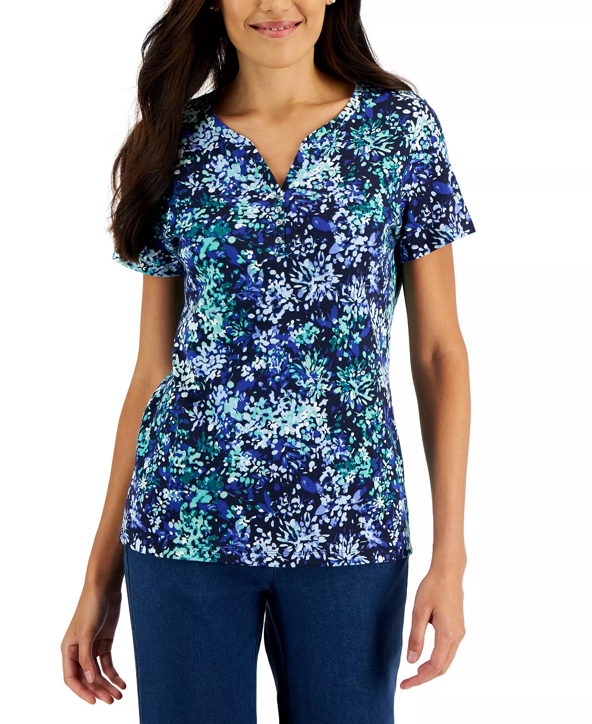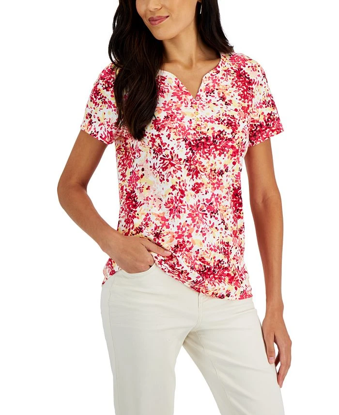 Adorned with blooming florals this top by Karen Scott is finished with an oh-so-pretty Henley neckline; the perfect addition to your casualwear favorites.